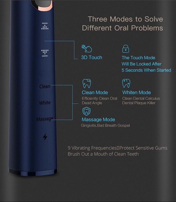 • Massage : Sử dụng 1 - 2 lần/tuần Mat-xa nướu, giảm các bệnh tụt lợi, chảy máu chân răng • Sensitive : Dành cho răng, nướu nhạy cảm hoặc lần đầu sử dụng bàn chải điện, làm sạch răng nhẹ nhàng, êm dịu cho nướu