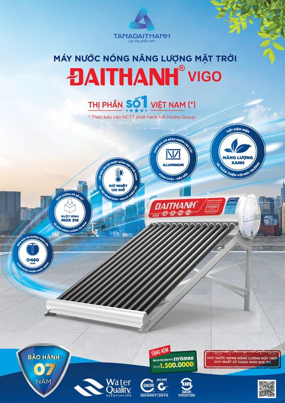 Sản phẩm máy nước nóng năng lượng mặt trời Đại Thành Vigo của Tập đoàn Tân Á Đại Thành tích hợp các công nghệ vượt trội của năng lương mặt trời thế hệ mới. Với chân giá đỡ sử dụng inox định hình mang lại độ cứng vững và tính thẩm mỹ cao. Sản phẩm có kiểu dáng và kích thước đa dạng, giá thành hợp lý phù hợp với các hộ gia đình, đáp ứng mọi nhu cầu của khách hàng.
